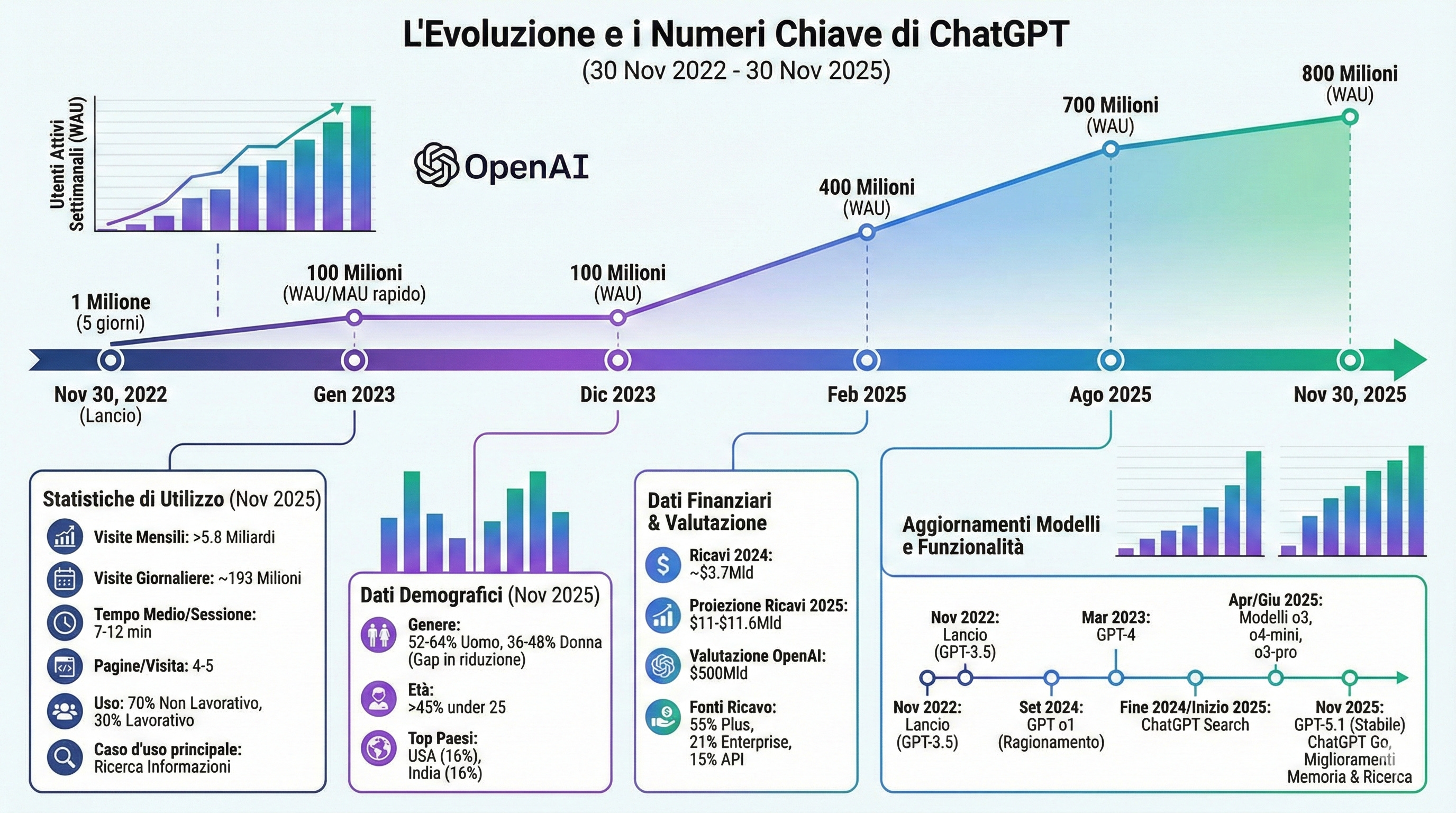 📈 Dal 30 novembre 2022, l’IA generativa è diventata parte del quotidiano: solo ChatGPT riceve un miliardo di richieste al giorno, con oltre 800 milioni di utenti attivi (e otto domande al giorno per persona).