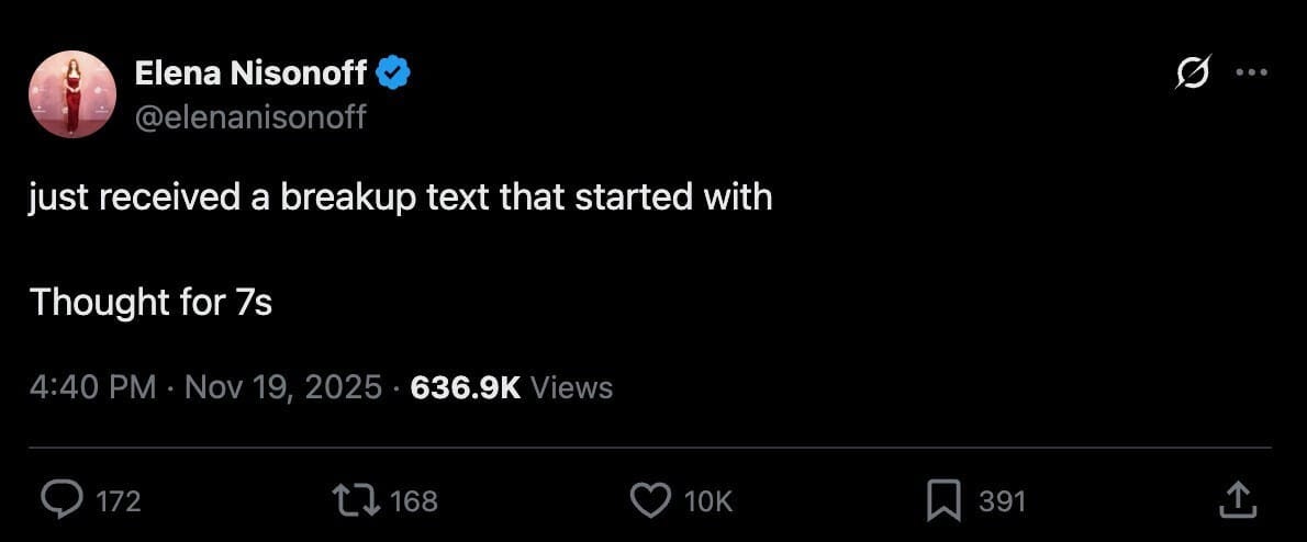 È diventato virale questo post della startupper Elena Nisonoff che ha ricevuto dal suo partner un messaggio in cui troncava la relazione. Il messaggio iniziava con “ci ho pensato per 7 secondi”, come se il partner avesse chiesto a ChatGPT di scrivere il messaggio, limitandosi a copiare il contenuto e inviarlo alla ragazza.